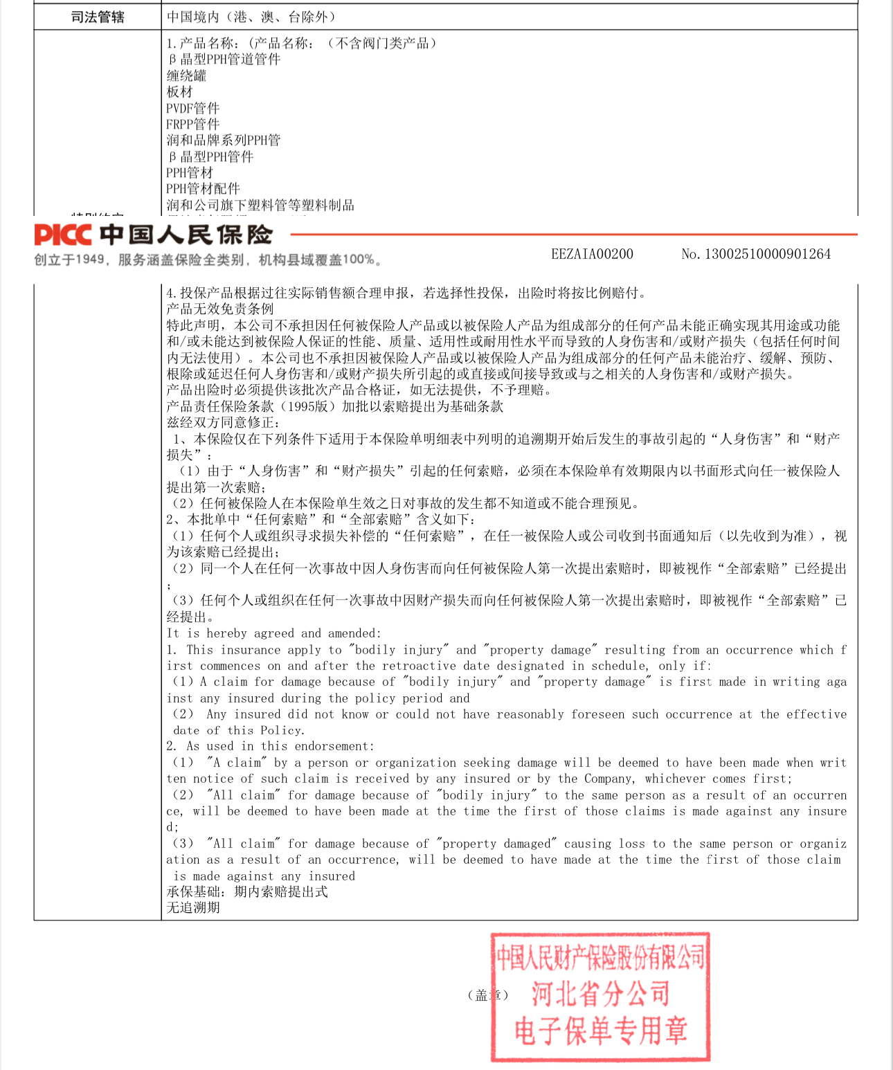 江苏金年会工程塑业工厂所生产所有β晶型PPH管阀件、PVDF管阀件、FRPP管阀件及板材缠绕罐等均由PICC承保,为您的项目企业保驾护航。多一份保障,多一份信任。